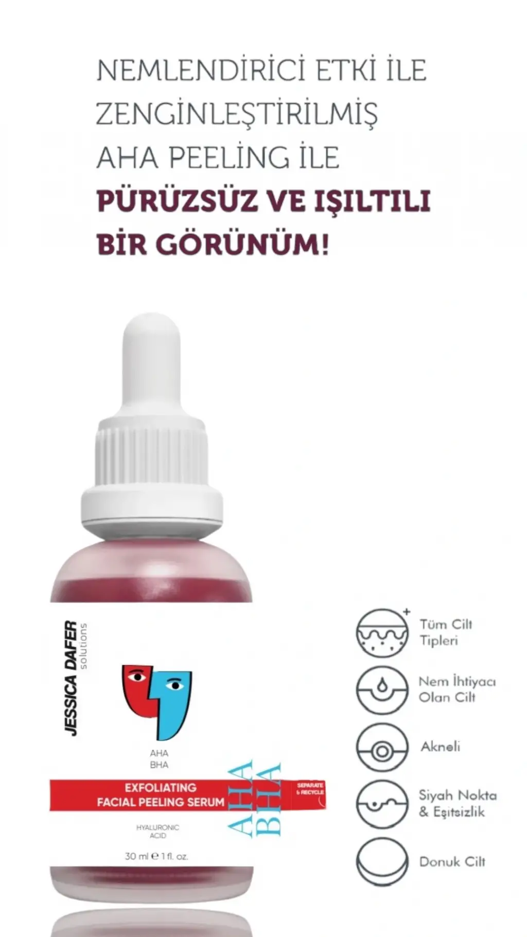 AHA Peeling: %10 alfa hidroksi asit (sitrik asit, laktik asit, malik asit, glukonik asit, glikolik asit, salisilik asit, tartarik asit, askorbik asit) ve %2 beta hidroksi asit (glikolik asit ) formülasyonu yatıştırıcı tazmanya biberi ekstraktı ve nemlendirici hyaluronik asit ile zenginleştirilmiş peeling solüsyon.