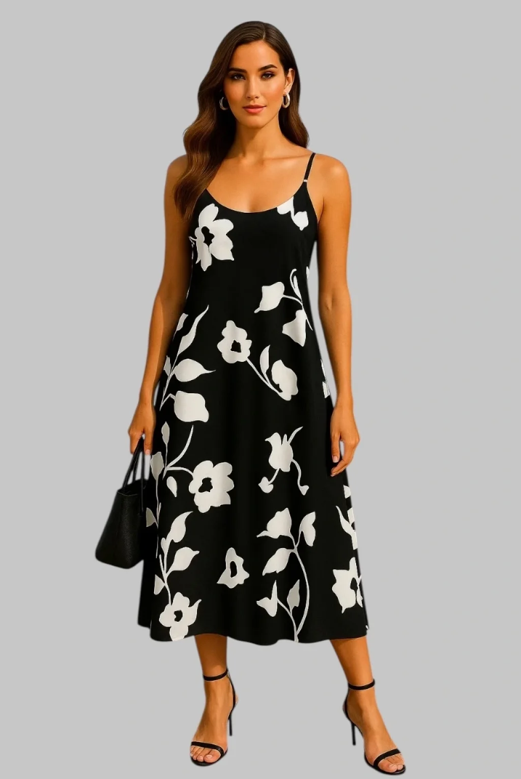 Flower Çiçek Desen Askılı İthal Saten Tasarım Elbise