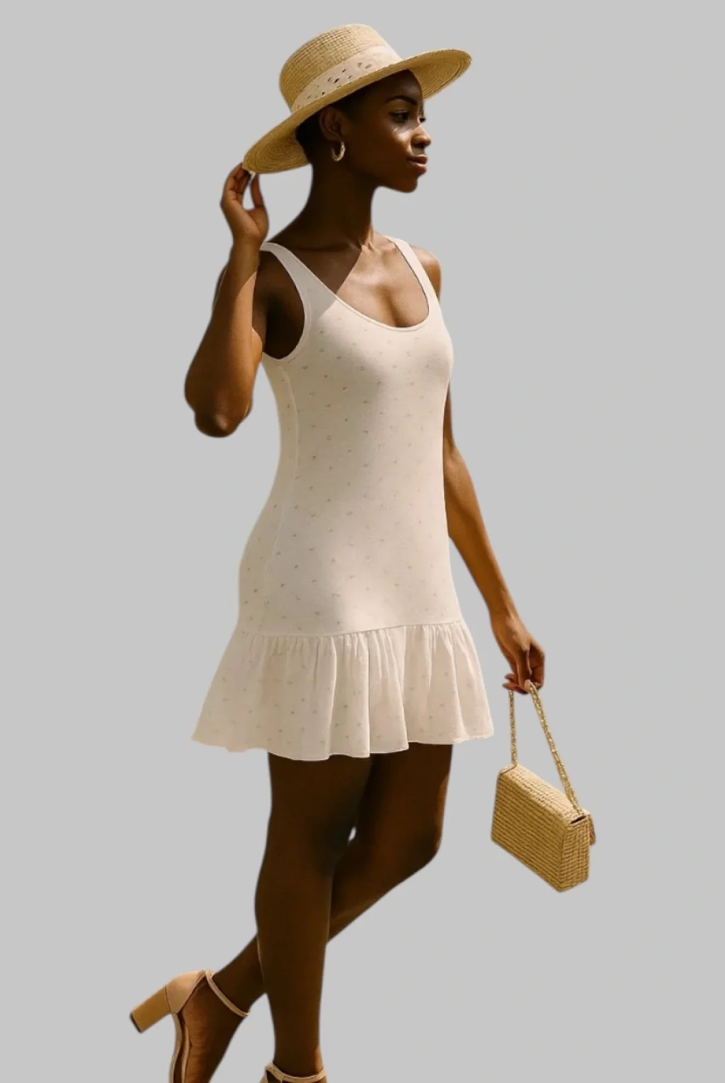 Gigi Örme penye kumaş yakma baskı detay beyaz renkli kolsuz astarlı Elbise