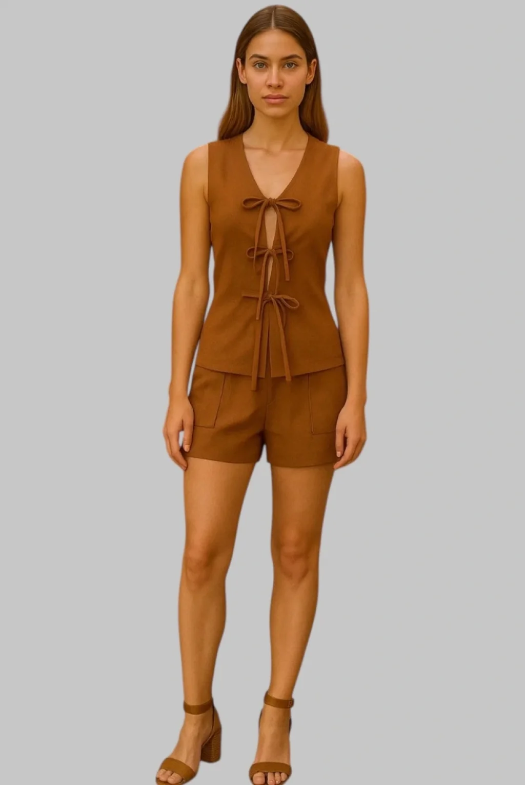 Monalisa İkili Keten Şortlu Takım Çift Cepli Kolsuz Bağlamalı Tasarım W 2026