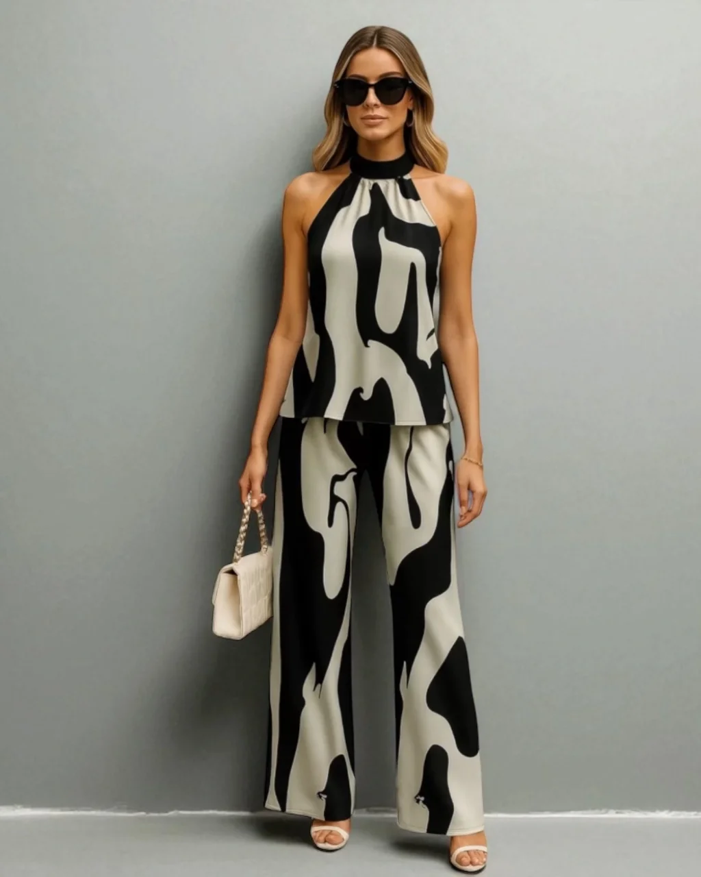 Gloria Şık ve Zarif Tatil Baskılı Bağcıklı Yeleksiz Uzun Pantolon