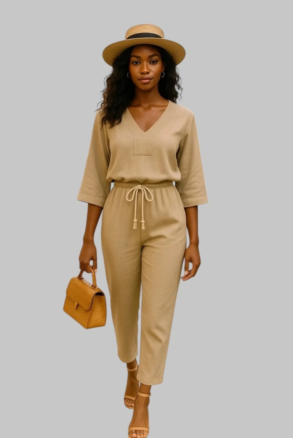Leda Melanj kahve keten ikili takım beli lastikli çıt cepli dirsek kollu ve yaka salaş bol kesim