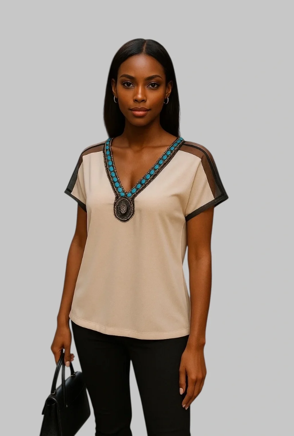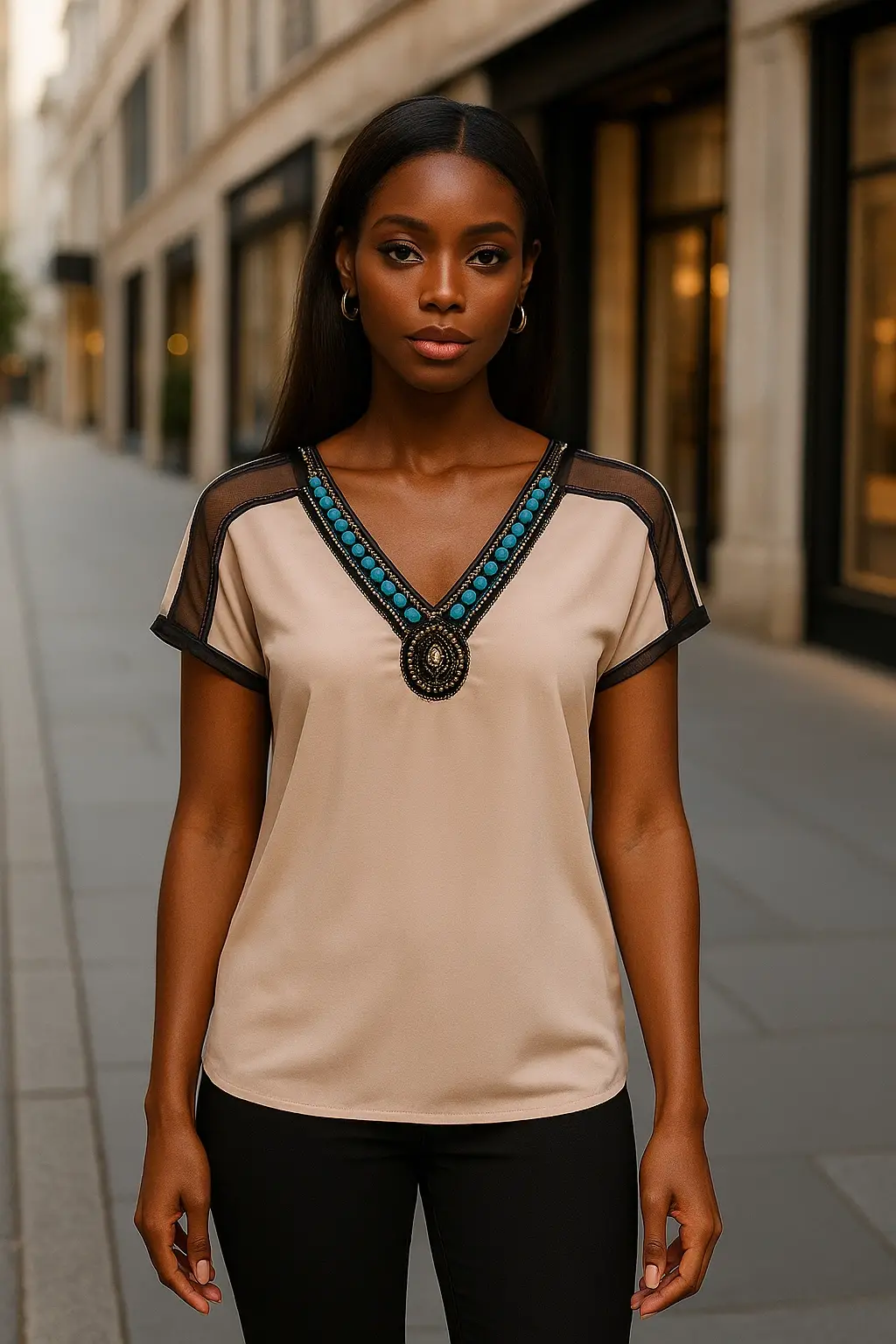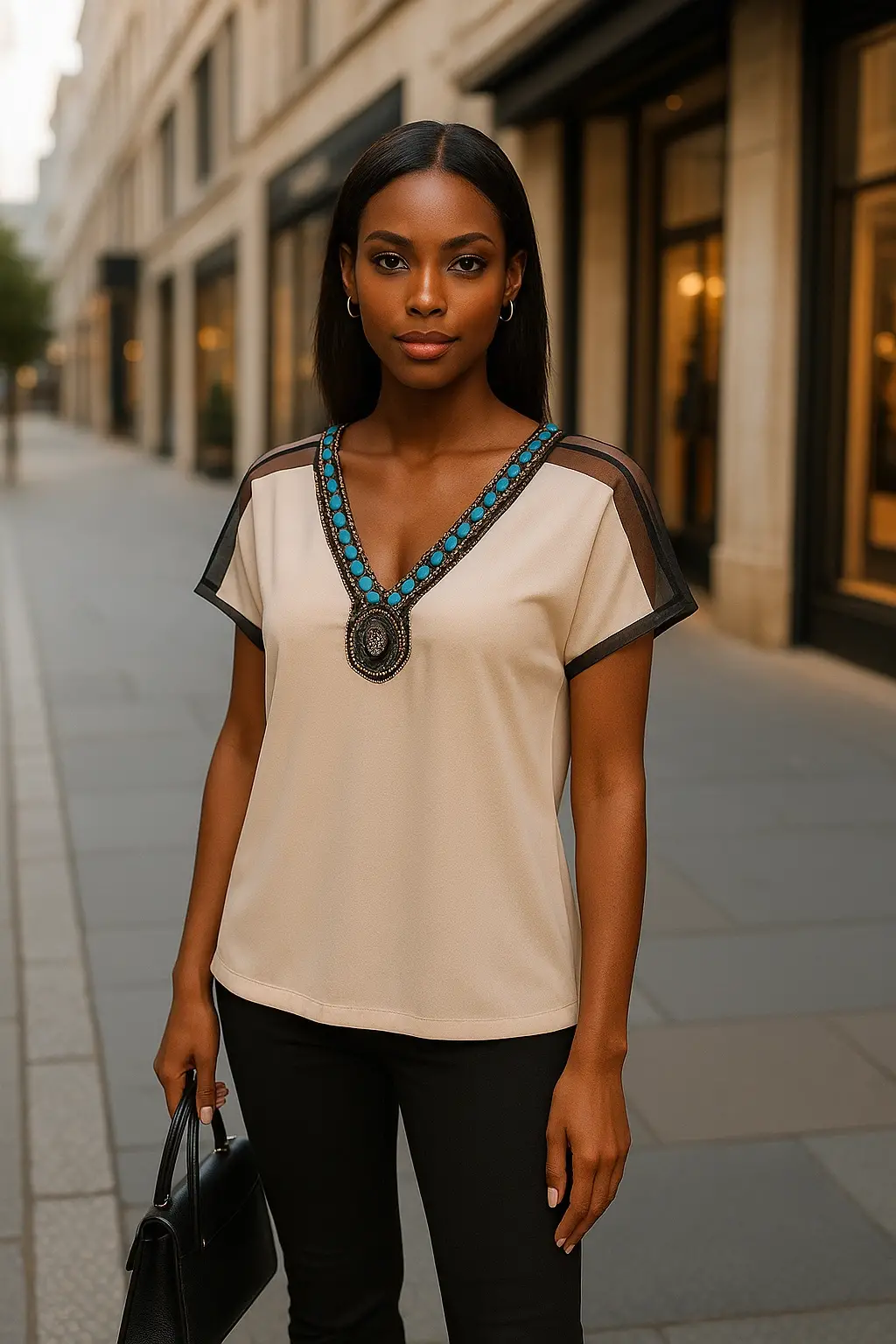 Wanda Omuz Tül Detay İthal Yaka Krep Bluz