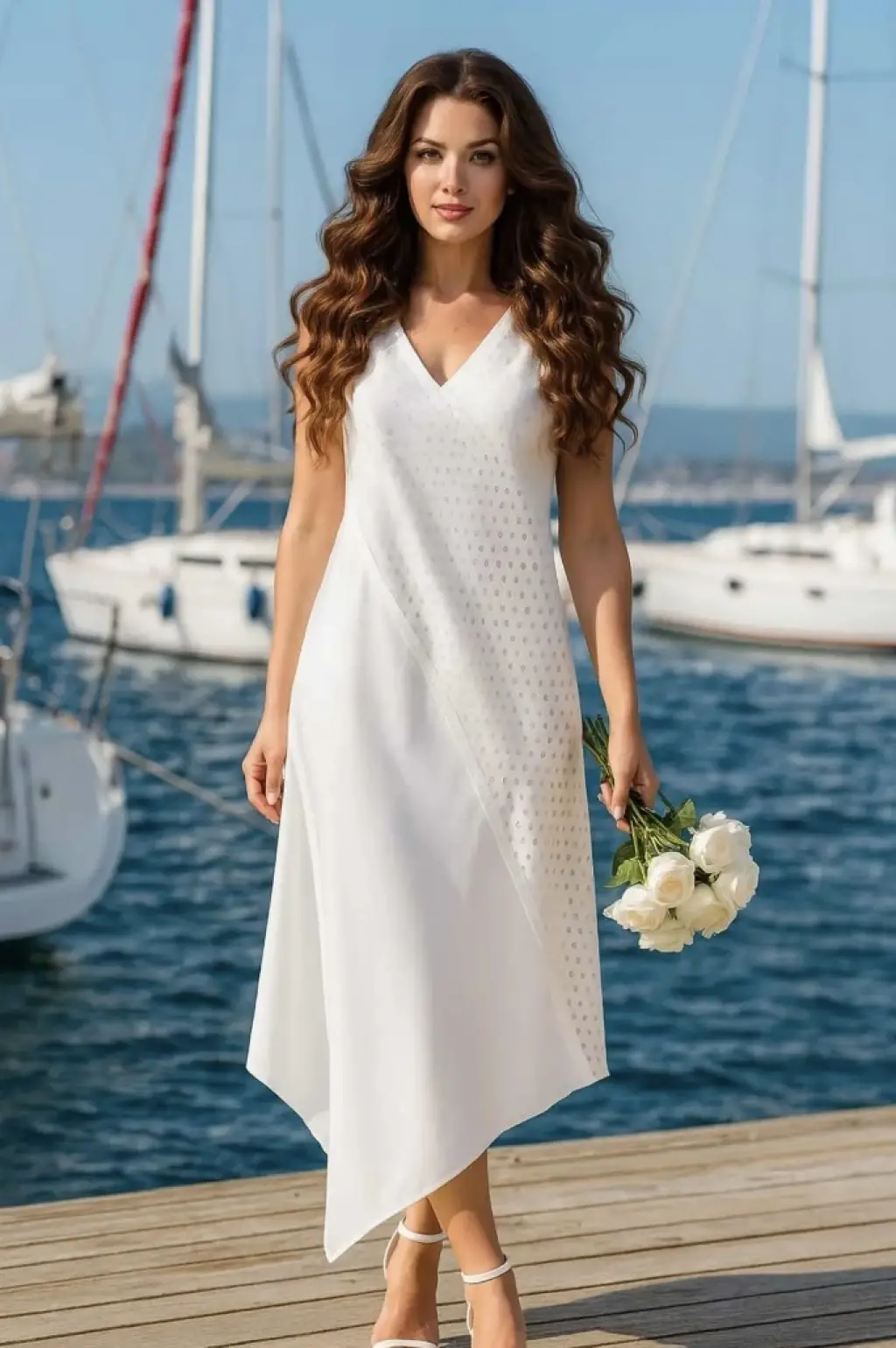 White Asimetrik Lazer Kesim Tasarım Elbise
