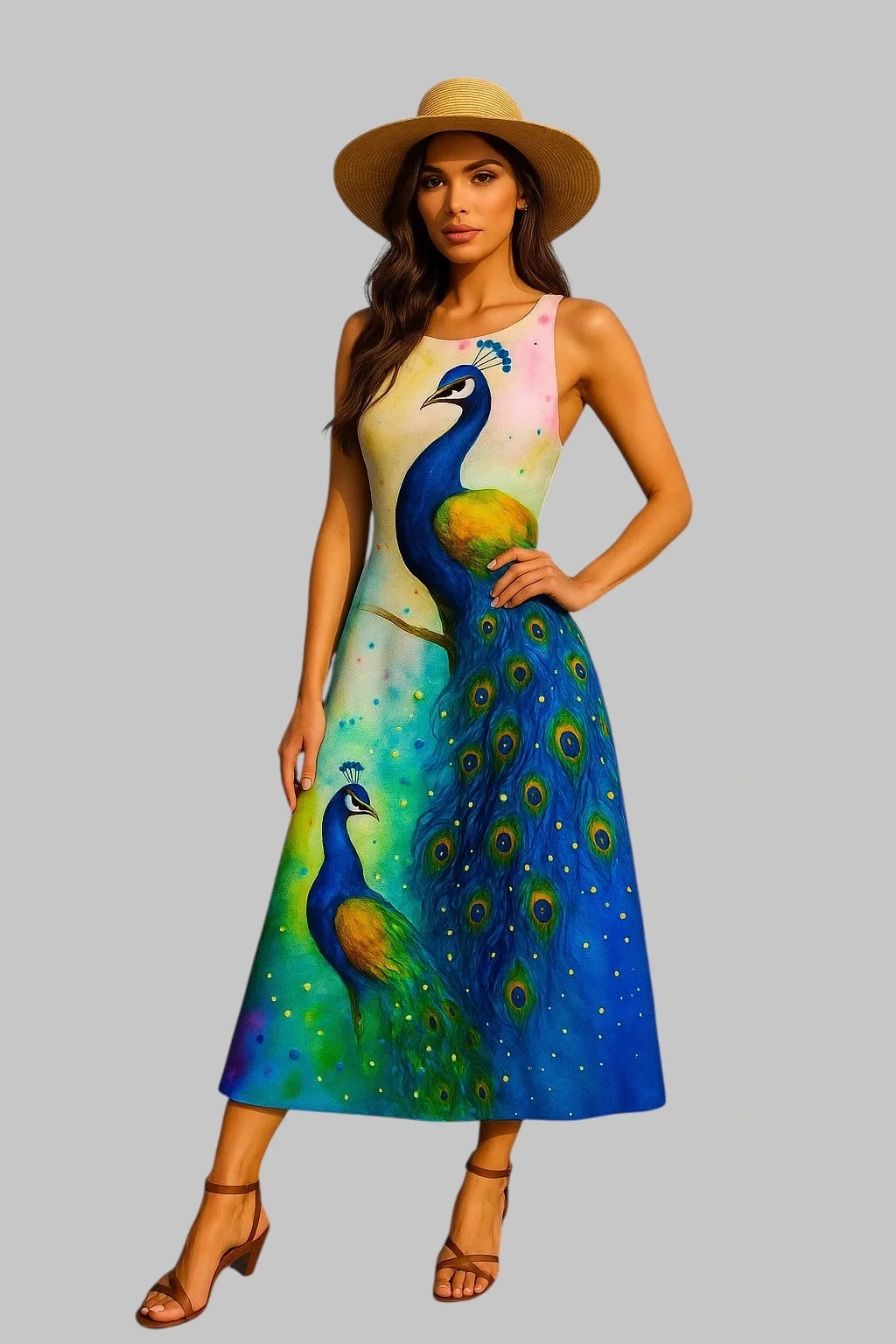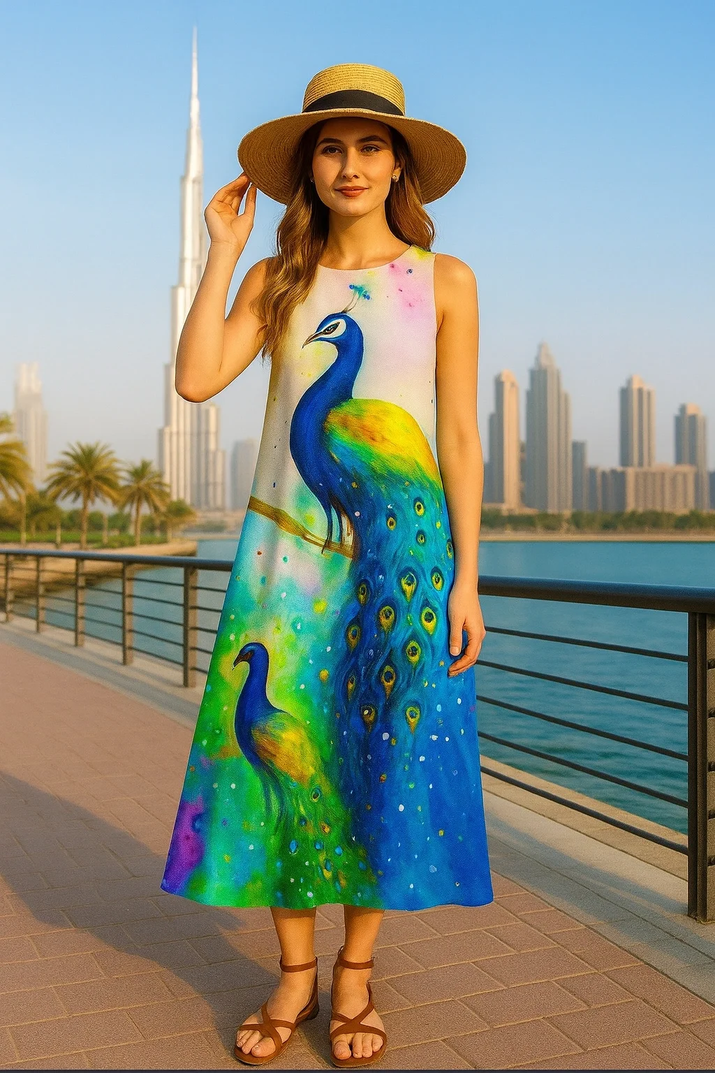 Lara Tavuskuşu Desenli Yaka Detaylı Elbiseler, Bahar ve Yaz İçin Rahat Kısa Kollu Elbise, Kadın Giyim