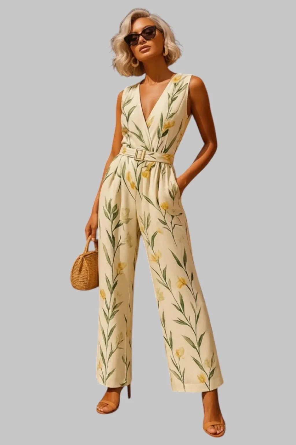 Siyadora Tropikal Şık Yaprak Desenli Tulum Ayarlanabilir Bel Bağcıklı Tasarım