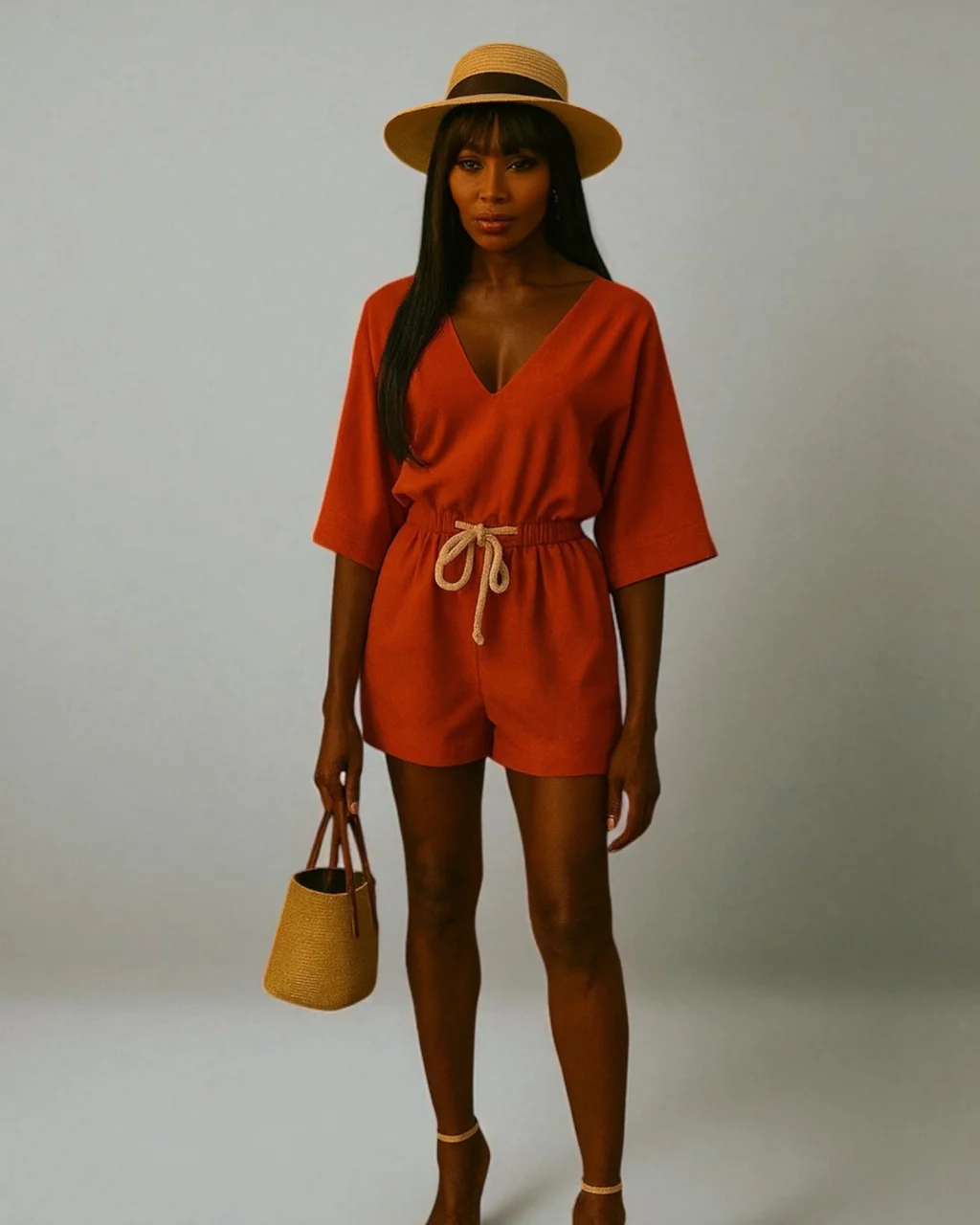 Vermont Oranj rengi v yaka turvakar kollu astarsızdır çift cepli regular şortlu organik keten beli lastikli kuşaklı ikili takı